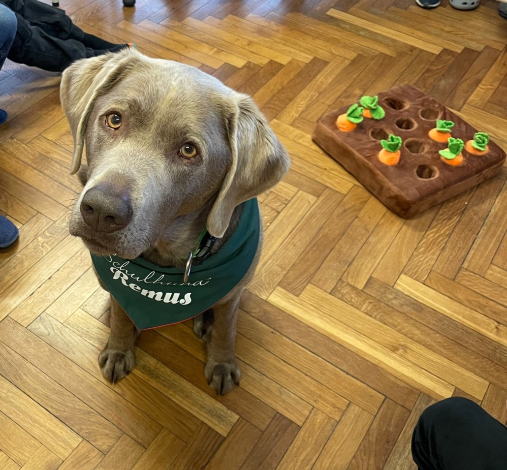 Im Januar 2025 startete Jasmin Volkmann mit ihrem Labradorrüden Remus die Ausbildung zum Schulhundteam. Seit einem, in diesem Rahmen durchgeführten, Wesenstest im November 2024, besucht Remus die Schule an zwei Tagen die Woche und trägt zum sozialen Lernen in den Klassen bei.